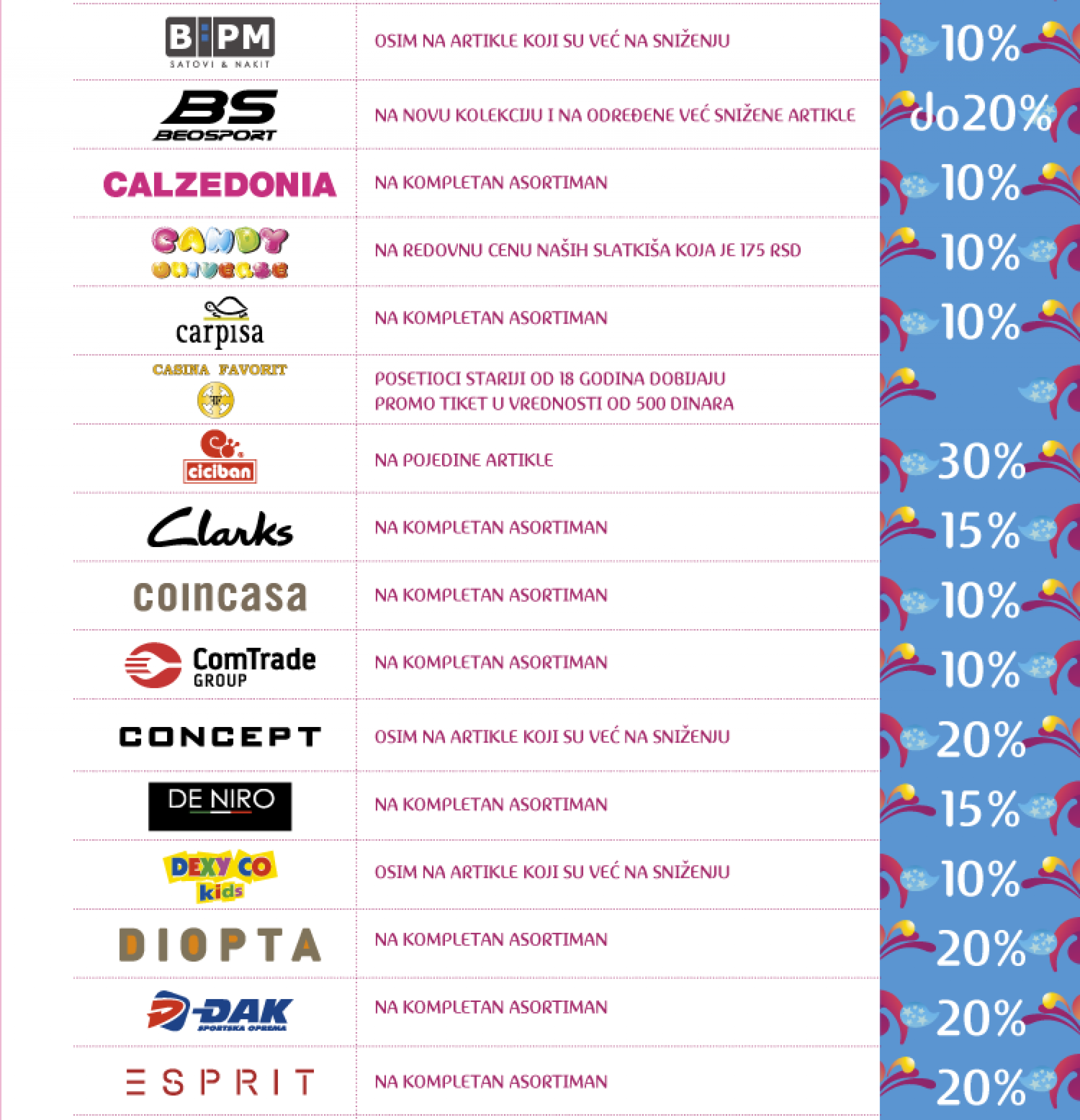 Pored odlične muzike, posetioci Delta City-ja imaće priliku da uživaju do ponoći u prolećnoj šoping groznici, ali i odličnim popustima do čak 50%, na aktuelne kolekcije brendova iz Delta City-ja.