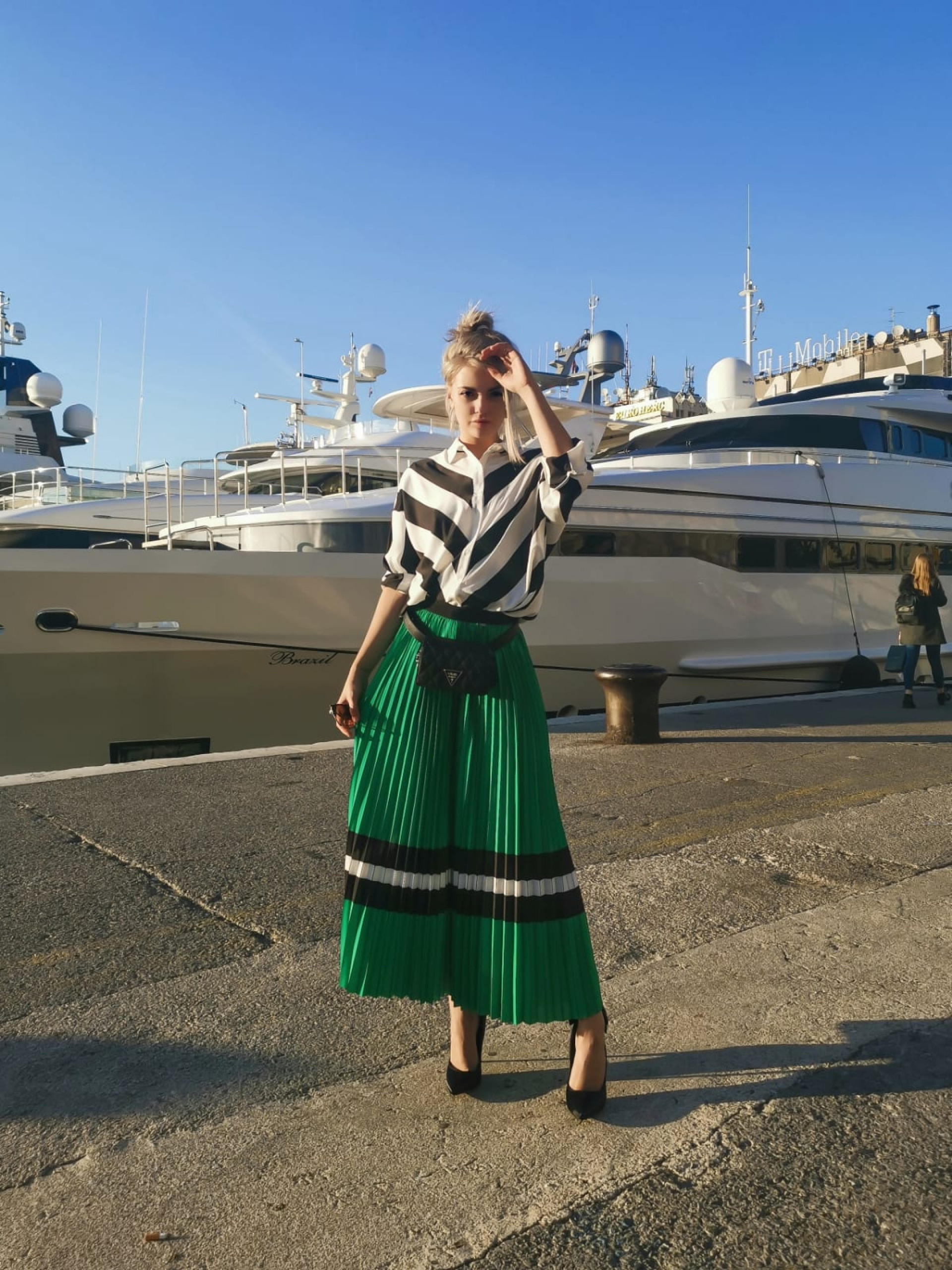 Elegantnu plisiranu suknju Ella je iskombinovala uz retro crno-belu košulju te print riblje kosti, dodala joj je klasične crne cipele na petu i torbicu oko struka. Ovakvu kombinaciju možete nositi na posao, za večernji izlazak ili šetnju gradom.
